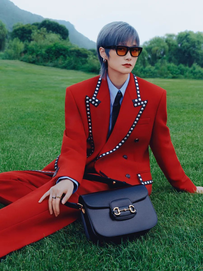 李宇春之前在大片里也演绎过Horsebit 1955系列皮革肩背包,用来搭配华丽的Gucci秀款,又是另一番观感。