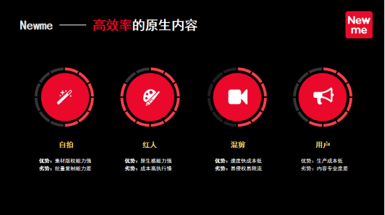 在内容层面上,自拍、红人拍、用户拍与混剪算下来各有利弊,自拍的优势是素材版权能力强,劣势是批量复制能力差;红人拍的优势是原生感能力强,劣势是成本高执行慢;混剪的优势是速度快成本低,劣势是易侵权易限流;用户拍的优势是生产成本低,劣势是内容专业度差。