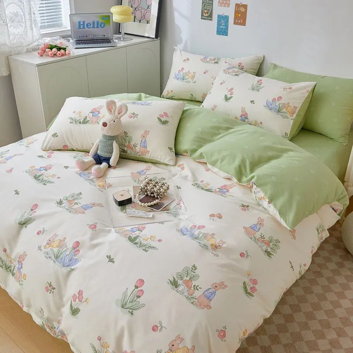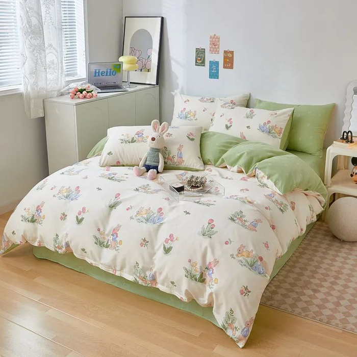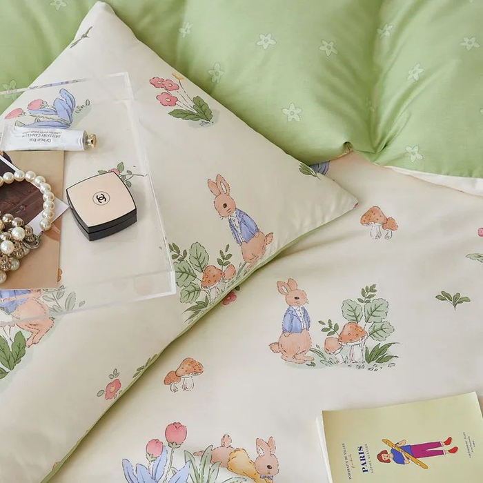 不同的小兔印花配合花朵,拼接淡然的绿,活泼俏皮,打造可爱小屋。