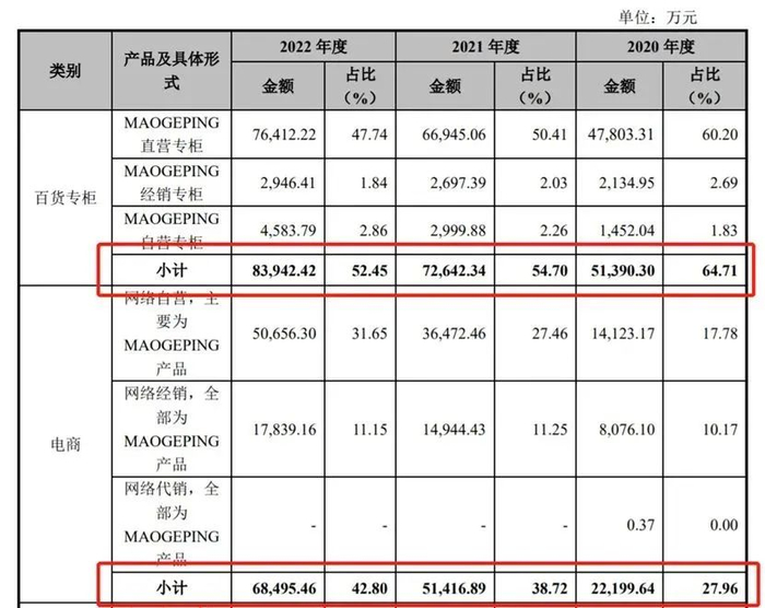 “重专柜”的销售成果也体现在了数据中。招股书显示,2020年到2022年三年内,MAOGEPING在百货专柜的销售收入占比均超过50%。
