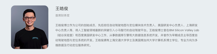 早在2016年12月,王皓俊作为公司创始成员加入小马智行,先后担任过美国研发中心负责人、上海研发中心负责人、乘用车智能驾驶业务负责人、首席运营官等,将人工智能领域最新的突破引入小马智行的自动驾驶平台。