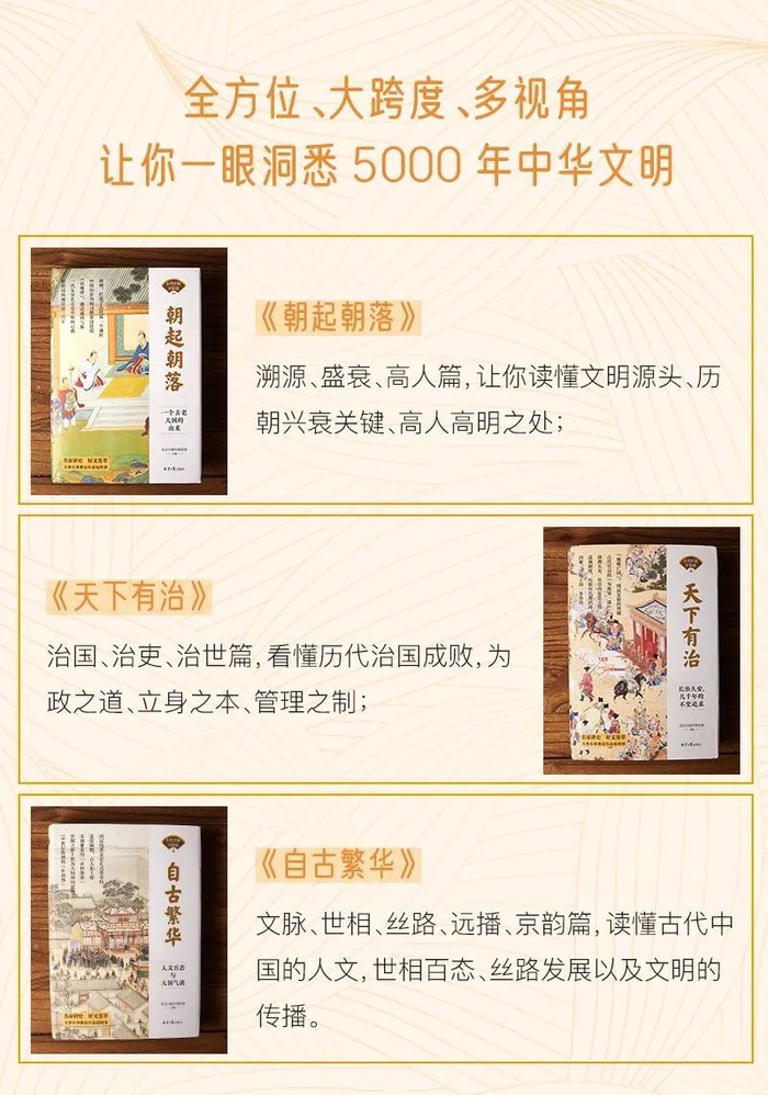 三本书,3大视角,11个主题,240多篇文章,全方位讲述了中国古代五千年的悠久历史,