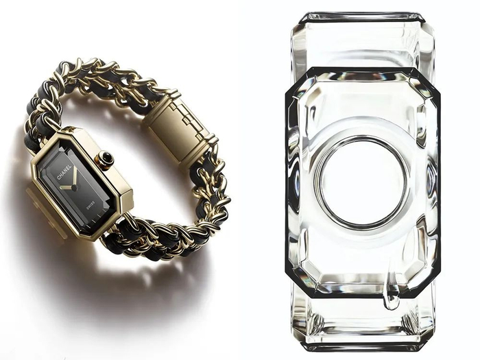 比如八角形的表壳,正好是5号香水的瓶盖。笔直对称的几何线条,简单几笔就勾勒出极高的辨识度。