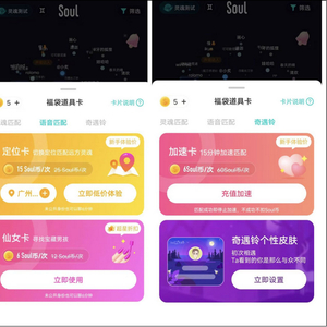 在奇遇铃下方,加速卡可以15分钟加速匹配,新手6 soul币一次,原价则要60 soul币,奇遇铃中,你还可以“氪金”设置自己的个性皮肤。