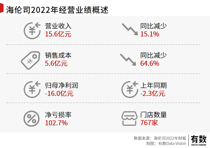 然而,海伦司却在黎明到来的前夜轰然倒下了:2022年财报里,营收15.59亿,净亏损16.01亿,其中光是关店带来的亏损就有8.53亿。它曾在招股书里立下“2023年开2200家直营店”的豪言壮志,现实却是一边开店一边关店,连亏了两年。