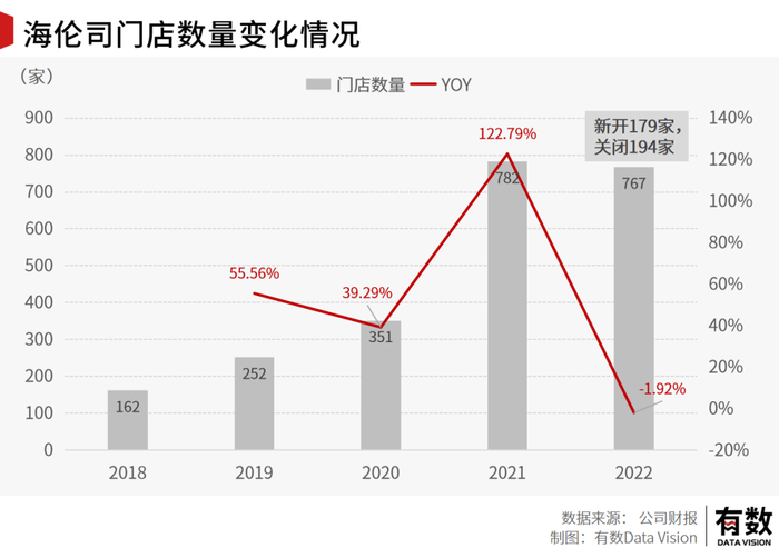 2021年,海伦司登陆港股,市值突破300亿港元,半年后门店数量就翻了一倍,达到782家,那是海伦司的高光时刻。