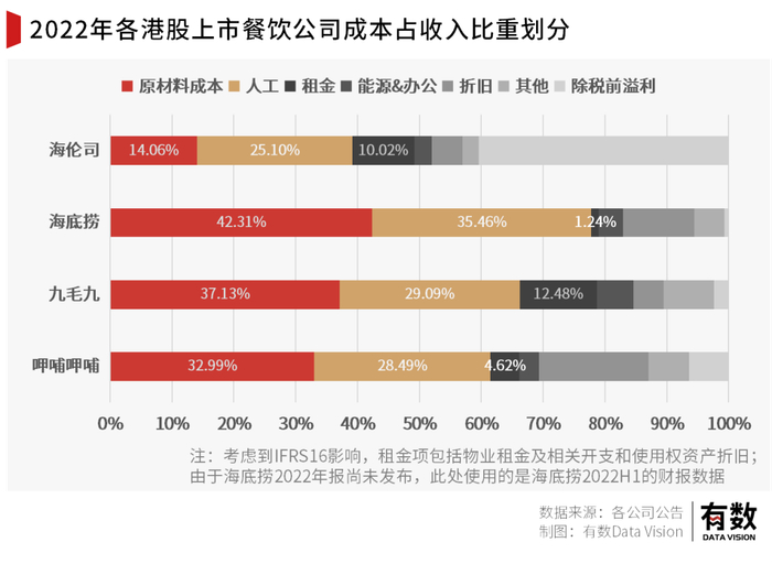 比如,海伦司有70%左右员工采用外包形式,人均员工成本仅为5.3万,而太二、捞王、凑凑人均成本在7.2万元左右,海底捞更是高达9万元。2021年,海伦司为了上市合规做了全员社保,人力成本上涨了6个点,但仍然比海底捞低得多。