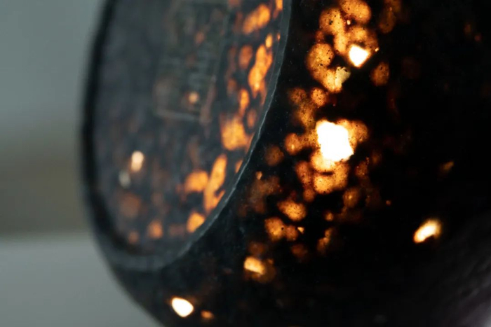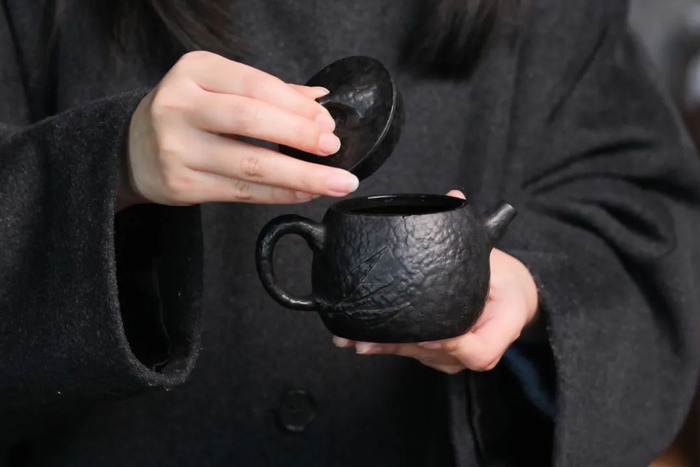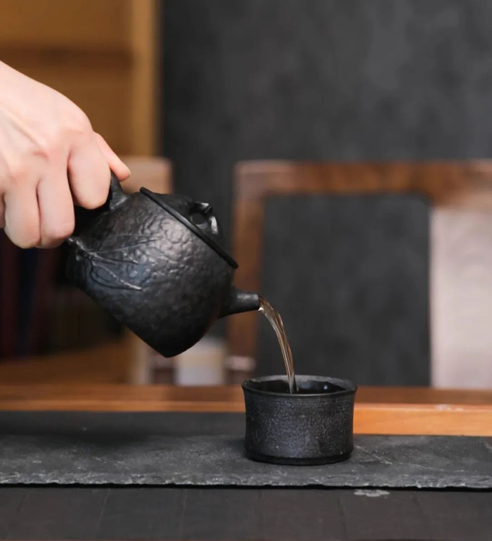 石壶不打蜡、不上色,自然乌黑润泽。经手工雕刻打磨后,呈现凹凸有致的纹路肌理,有一种饱经风霜、返璞归真的自然美感。