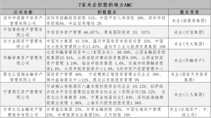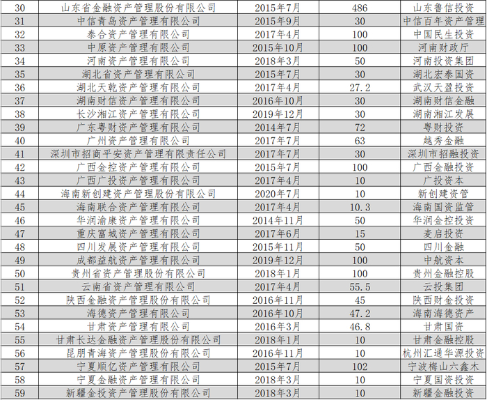 民营企业控股的主要有10家,分别为上海睿银盛嘉资产管理、天津滨海正信资产管理、重庆富城资产管理、国厚资产管理、湖北天乾资产管理、黑龙江省嘉实资龙昇资产管理、吉林省金融资产管理、庆源绿色金融资产管理和海德资产管理。