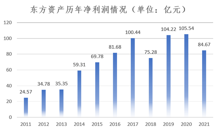 在2017年、2019年、2020年,东方资产分别创造了100.44亿元、104.22亿元以及105.5亿元三个自身历史上的净利润百亿高光时刻,尤其是2020年,中国信达净利润147亿,长城资产21.73亿,而中国华融在那一年亏损1029亿,东方资产的105亿非常亮眼。