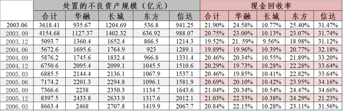 这期间经历了三次剥离收购,共剥离不良资产约2.2万亿。资金来源于央行再贷款以及发行债券。第一次剥离是2000年政策性收购银行业不良资产,按面值1:1收购各自对口的银行不良资产(其中信达资产对口建设银行,华融对口工商银行,东方资产对口中国银行,长城资产对口农业银行)。第二次是2004年进行的商业性剥离,按面值五折收购中国银行和建行的不良资产。第三次是2005年有限竞争的市场化剥离,按逐包报价原则,由四大资管竞价,收购工行的不良资产。