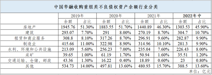 华融在这部分业务中将大量资金投向了房地产,其子公司包括华融信托等,房地产业务规模依然庞大。压降这部分业务成为最近几年中国华融的“规定动作”从下图中,可以看出,到2022年中,收购类重组业务规模相比2019年减少了1000亿。