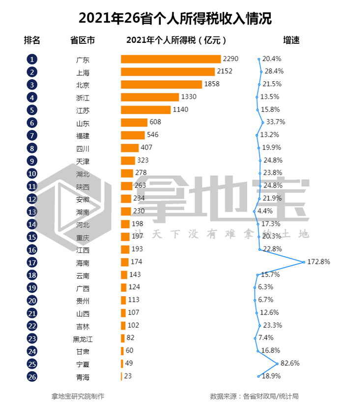 其实这一问题在2021年就已经凸显了。地宝研究院通过对各省财政局、统计局2021年个人所得税的梳理发现,全国共有26省公布了一般公共预算收入中的个人所得税数据,该数据是上缴中央六成后的余额。