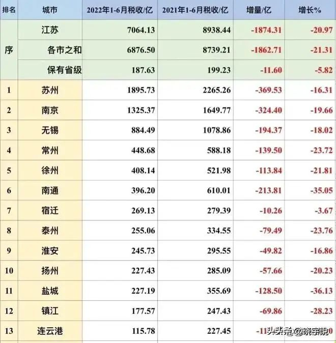这是2022年上半年江苏各市税收状况。