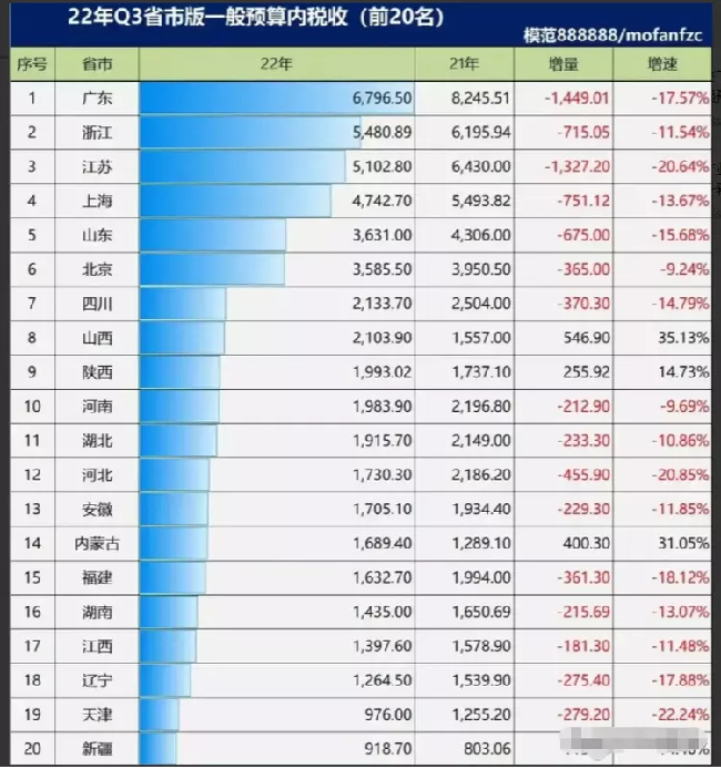 到了2022年第三季度,江苏省税收状况还在进一步恶化。在2022年三季度我国一般预算内税收20强省份中,浙江扩大了对江苏的优势,处于第2位,山西和陕西进入前十,内蒙古领先福建、湖南。
