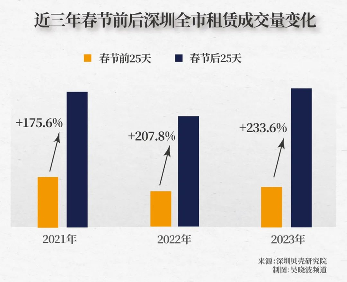 看一组大数据:深圳贝壳研究院调查:春节后25天(1.28—2.21)租房成交量环比增长233.6%,并且超过了2022年的207.8%和2021年的175.6%;2月议价率(与房东可议价空间)为6.1%,与前一个月相比下降0.2%。