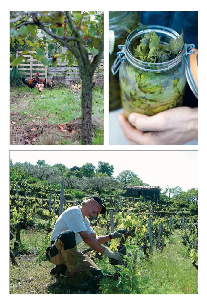 |左上:整体农耕法的重点就是要有畜牧业;右上:酒庄主用园内植物做的肥料;下:Frank Cornelissen正在用低干预法照料葡萄藤