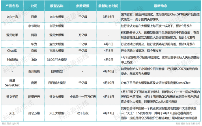 截止4月上旬,国内已有多家头部企业发布/或预发布了自己的大模型,其中包括了: