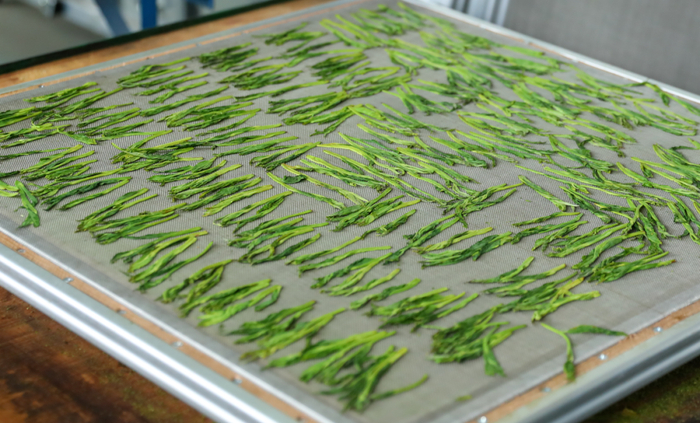 将杀青后的茶叶一根一根用手捋直,均匀、整齐地铺放于特制的木质铁纱网盒上。捋直时,要求用手指将两叶包裹住嫩芽,形成太平猴魁独特的“两叶抱一芽”的特征。