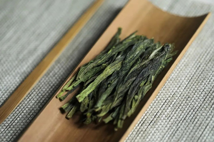 叶脉绿中有隐红,俗称“红丝线”,扁平匀整,两端稍尖,芽头含而不露,可见白毫。手工挑捡和整形,上面还有方格压痕。