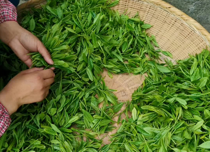 将精心挑捡出的鲜叶原料,摊入竹匾或竹垫上进行轻度萎凋,使其少量失水,便于杀青。