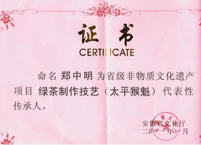 郑中明出身于猴魁世家,曾祖父郑守庆为太平县著名茶商,猴魁最初便是由郑中明的太爷爷郑守庆与其父亲郑本懋创制。