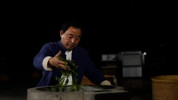 理直的茶条放到特制的成型机上,用木制滚筒轻轻滚压,手工压扁成型。