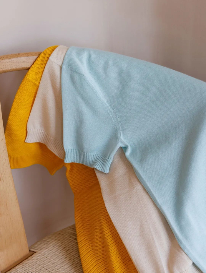 这件圆领T恤则是100%纯棉,蜂窝织纹提花很有立体感,颜色也特别温暖明亮。