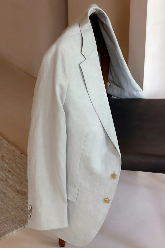 剪裁也很精妙,针脚处些微手工处理的痕迹,流露出不动声色的老钱式贵气。而无衬里结构设计,让它有种“看起来厚、穿起来薄”的神奇感觉,上身比想象中还要轻盈舒服,亚麻材质凉爽自在,风度和舒适度可以兼顾。