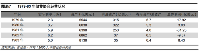 1980年代初期,大批储贷协会亏损严重。美联储大幅加息后,1981-1982年储贷协会净息差仅为-1.0%至0.7%,总利润从1979年的17.9亿美元,迅速下降到1980年的3.0亿美元,随后在1981年大幅亏损31.3亿美元。到1982年年中,储贷行业整体资本净值为负,其抵押品的市场价值为1000 亿美元,仅占负债的15%,有形资产在总资产中的占比更是跌落至0.5%以下。在此期间,储贷机构总资产规模虽然仍在增长,但同比增速明显放缓,从1975-79年的10%以上下降至1982年底的1.1%。