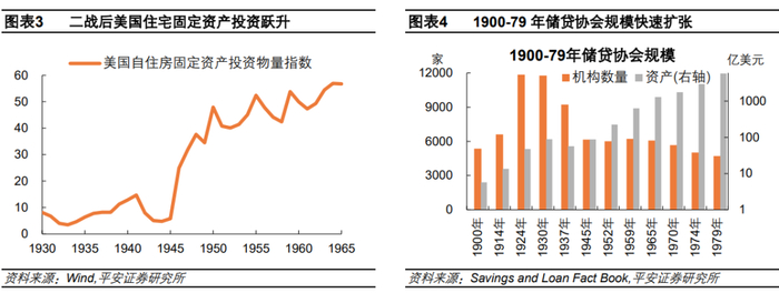 “大萧条”加速储贷行业出清。由于美国内战和经济危机等,储贷协会的发展并不一帆风顺,但到1930年全美已有约1.2万家储贷协会,总资产也近90亿美元(占GDP比重约10%)。在1929-1933年大萧条期间,由于贷款人不断违约、房产价值一落千丈、储户纷纷挤提,1937年储贷协会数量和资产较1930年分别减少21.7%和35.6%,降低至9225家和57亿美元(占GDP比重约6%)。为了应对危机,美国实施了新的住房政策,1932年和1934年分别通过《联邦住房贷款银行法案》和《全国住宅法》,建立了联邦住房贷款委员会(FHLBB)和联邦储贷保险公司(FSLIC),监管储贷协会的日常经营并以统一费率向储贷协会收取存款保险费,这些举措支持和保障了后来储贷协会的发展。