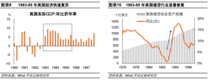 1983-1985年,在宏观环境改善和地产复苏的背景下,储贷协会暂时扭亏为盈。1982年美国GDP同比下跌1.8%后,1983年-1985年美国经济强劲恢复、通胀减速,GDP和CPI年均复合增速分别达到5.3%和3.7%。通胀可控后,1983年联邦基金利率由此前的20%左右下行至10%以下,储贷协会受利率压抑的状况有所缓解。随着美国经济复苏,叠加人口增长预期(1960年代“婴儿潮”孕育1990年代初人口增长)、住房政策扶持、金融自由化等助推,美国房地产市场也快速修复,房价重新走入上升通道。尽管房地美房价指数同比增速在1982年中有10个月为负且最大跌幅高达6.9%,但1983年就有9个月的同比增速超过10%,1984年和1985年房价也依然保持着5%左右的增速。在经济复苏和房地产回暖的背景下,1983年储贷协会扭亏为盈,盈利8.4亿美元,资产增长18.6%,1985年储贷协会的总资产已是1982年的1.5倍以上。