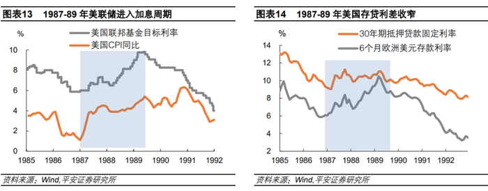 1987-1989年美联储重回加息周期,进一步加重了储贷协会负担。1987年-1990年,油价重回上涨和经济短暂复苏使美国通胀低位反弹并快速上行,CPI同比增速分别达到3.6%、4.1%、4.8%、5.4%。此外,1987年签订的《卢浮宫协议》要求美元汇率停止贬值,这也要求美联储提高利率。1987年1月开始,美联储整体进入加息周期(除了1987年10月的“股灾”导致美联储紧急降息三次,但1988年3月重新加息),联邦基金目标利率由1986年8月的5.88%,升至1989年5月的9.81%。在此背景下,储贷协会存贷利差再次受到挤压。