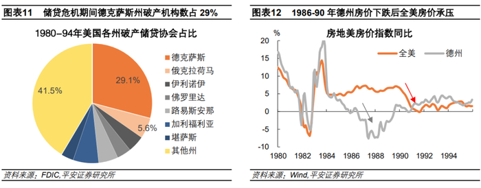 1986年产油国争夺市场份额,油价暴跌使德州等能源州地产泡沫破裂,储贷协会遭受打击。1979-1981年第二次石油危机后,WTI油价由15美元/桶以下蹿升至30美元/桶以上。美国德克萨斯州等西南地区为“能源州”,油价高涨带来繁荣的经济和良好的预期,并且州立法机构允许投资者投资于投机性房地产,催生了地区房地产市场过度繁荣。到1986年,由于OPEC对产油国价格战的默许,油价迅速下跌,甚至一度逼近10美元/桶。美国“能源州”经济普遍陷入衰退,并引发房价下跌,刺破了前期过度投资而形成的“地产泡沫”,使储贷协会遭受严重损失。德州储贷协会大量破产,直接导致FSLIC的保险基金耗尽,社会公众对美国金融体系的信心遭受重大打击,储贷协会破产潮逐步蔓延到全国。美联储数据显示1988年储贷协会破产高峰期时,全国超过40%的倒闭和救助发生在德州,而FDIC数据显示整个1980-1994年德州破产机构的数量和资产占全美的比重分别为29.1%和21.4%。