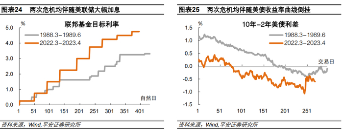 其次,两次危机的宏观背景都是高通胀和美联储大幅加息。这一压力的直接体现是美债收益率曲线的倒挂,这一方面表现了市场对经济的悲观预期,也切实削弱了银行的放贷和盈利能力。