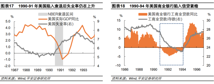 其次,1990-1994年美国银行业持续出现信贷紧缩。美国所有商业银行工商业贷款同比增速,由1989年底的6%下降至1994年初的-1%,工商业贷款与所有存款的比值也由29%大幅下降至18%。