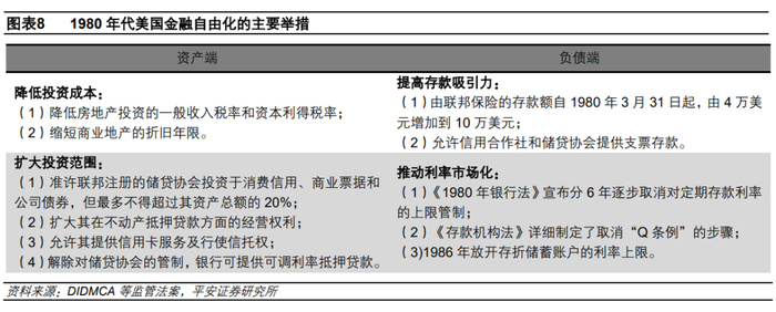 1980-1986年,美国政府为储贷协会“松绑”,推动利率市场化、放松资产端和负债端的管制。1980年和1982年美国分别通过了《存款机构放松管制与货币控制法案》(简称《1980年银行法》,DIDMCA)和《存款机构法》(又称《甘恩-圣杰曼法》)。这些措施同时缓和了储贷协会资产端和负债端的压力。资产方面,政策支持可调整利率的抵押贷款、提高贷款额度,同时,储贷协会被允许投资公司、地产和商业债券等风险资产,储贷协会亏损最严重的多个州管制几乎完全放开。负债方面,1982年《存款机构法》宣布分6年逐步取消“Q条例”,放开了对定期存款利率的上限管制。这一举措提高了储贷协会吸收存款的能力,但也迫使其必须提高资产端的收益,去购买高风险、高收益的资产。
