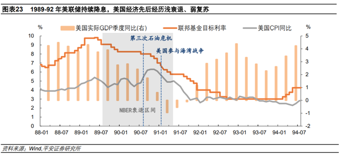 1989-1992年,美联储以经济为准绳启动了为期三年的降息周期,累计降息24次、6.8个百分点。