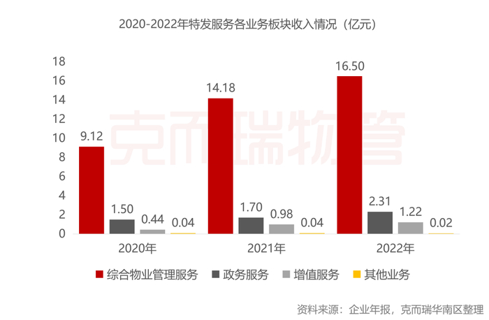 按产品分类来看,特发服务营业收入构成共来源于四部分:综合物业管理服务、政务服务、增值服务、其他业务。2022年,特发服务已形成以综合物业管理服务为核心,政务服务及各类增值服务协同发展的经营模式,多元化发展的格局逐步形成。2022年,综合物业管理服务收入为16.50亿元,占总收入比例82.26%,是第一大收入来源;政务服务收入2.31亿元,占比11.54%;增值服务收入1.22亿元,占比6.07%;其他业务收入246.98万元,占比0.12%。