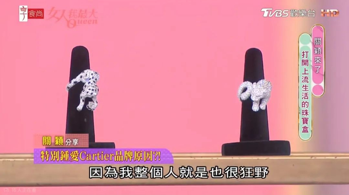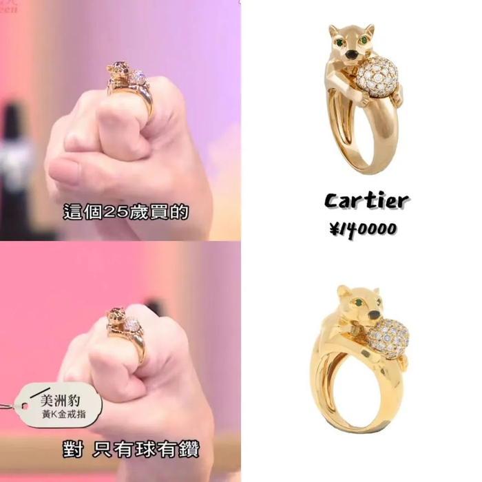 在“亲子豹“后,关颖接下来在节目中晒了自己在25岁时买的Panthere戒指,设计很独特,是猎豹抱着一颗钻石球,在2000年代初以20万新台币入手。
