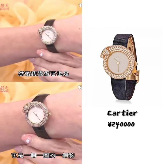 她还顺手晒了一款相对“低调”的猎豹腕表,也是不出意外的镶钻款式。