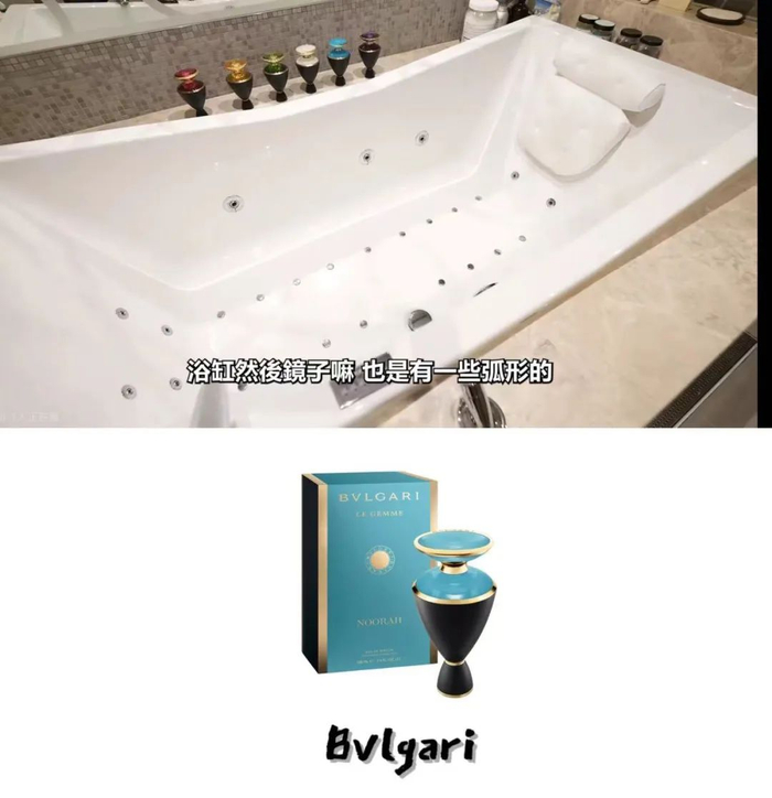 浴缸边码放着六瓶单价超2000元的Bvlgari沙龙香水。