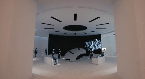 步入展厅的圆形空间,会看到中央巨大的旋转镜面,模拟出机芯转动的样子,有种时间缓缓流逝的感觉。
