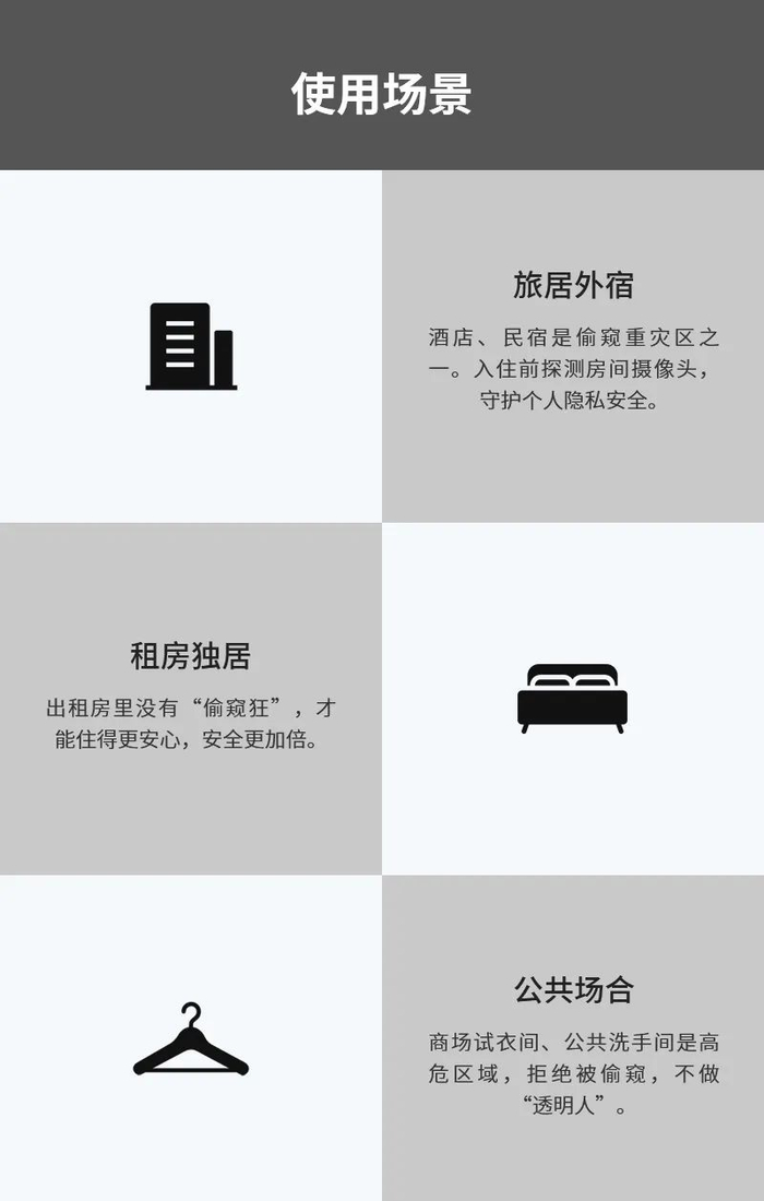 无论什么类型的针孔镜头,且适用于浴室、卧室、办公室等各种场景,通过它均能探测得一清二楚,让它们即刻现出原形,简单实用。
