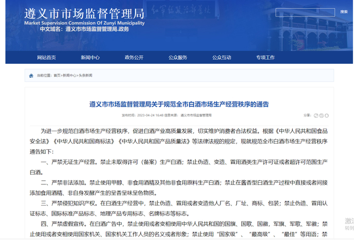 4月24日,遵义市市场监督管理局发布通告,对全市白酒市场生产经营秩序做进一步规范管理,促进白酒产业高质量发展,切实维护消费者合法权益。《通告》明确,企业要规范经营,严禁无证生产经营、非法添加、侵犯知识产权、虚假宣传,以及严禁不正当竞争等违法行为。有违反的,市场监督管理部门将依法严肃查处;涉嫌犯罪的,依法移送公安机关追究刑事责任。