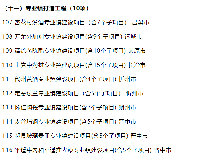 4月20日,山西省政府发布2023年省级重点工程项目名单。吕梁市杏花村汾酒专业镇建设项目(含7个子项目)、忻州市代州黄酒专业镇建设项目(含4个子项目)、晋中市祁县红星白酒产业园迁建项目、吕梁市汾青基地2万吨原酒酿造一期项目入选。