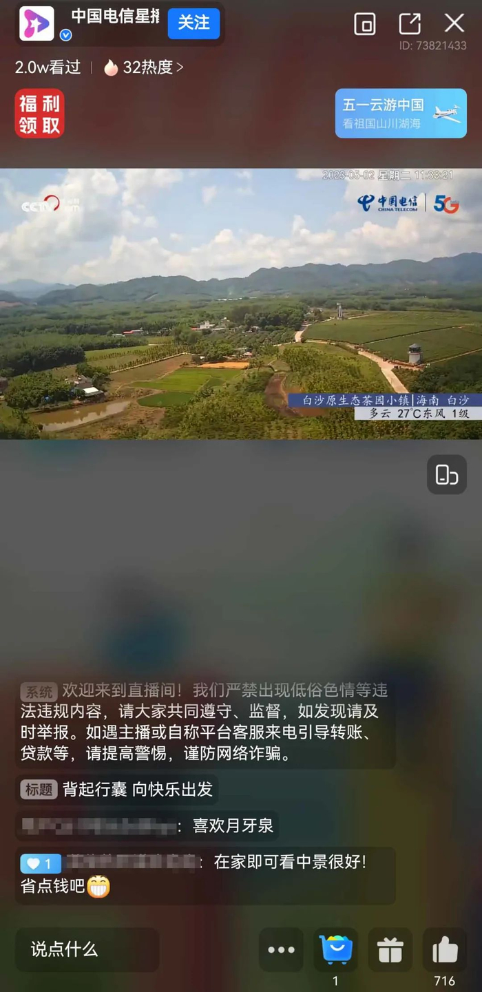 有个人就挺知足常乐的,在中国电信的直播间里留言说“在家里即可看风景很好!省点钱吧”,还配了一个憨厚的笑脸emoj表情。