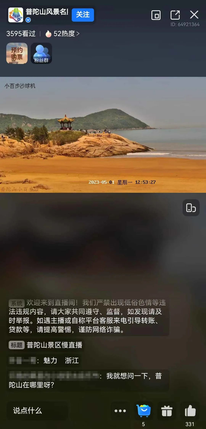 不过也有人看到直播间的风景后心动了,一个劲在弹幕里问“普陀山在哪儿?”,也不知道是不是打算先在直播间里“踩点”,等五一过去再去玩儿。