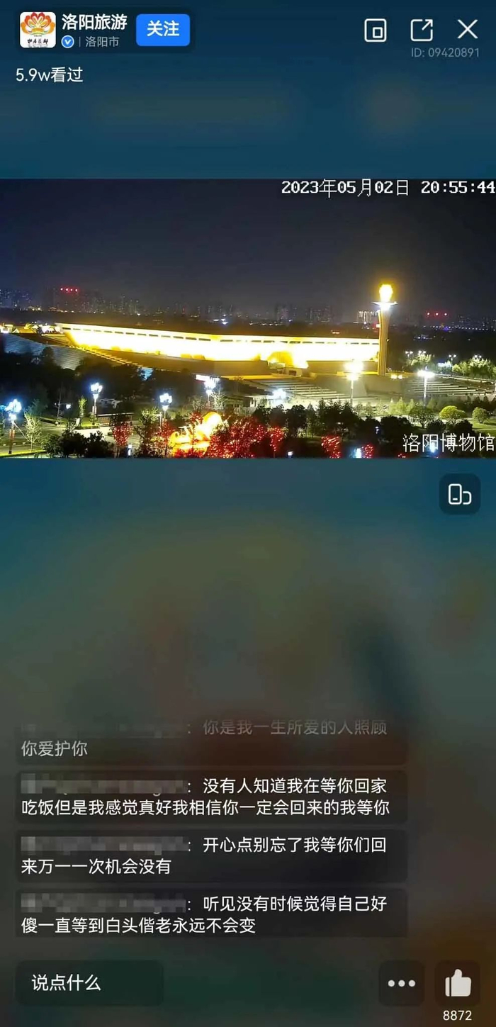 但无论是洛阳旅游还是洛阳博物馆,大概都不会想到,竟然有人在直播间里发了一条又一条弹幕,对着洛阳城里的夜色,吐露着自己的思念和焦灼。