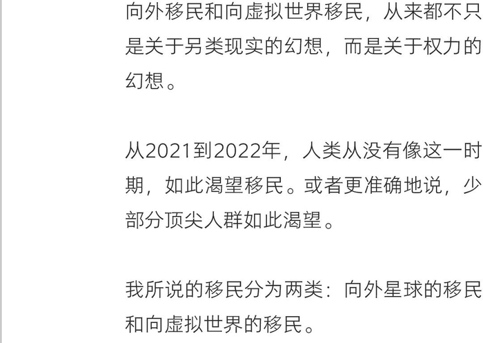 由此看来,对于我们这个星球上的少数顶尖成功者来说,向外移民和向虚拟世界移民,其实是一回事。元宇宙的沉浸式空间,火星上的异世界殖民地,都是把科幻化为现实,是溢出无趣的当下社会的超级想象力。然而,元宇宙也好,火星殖民地也罢,从来都不只是关于另类现实的幻想,而是关于权力的幻想。而现在,这些未来空间的开创者拥有追求幻想的资本和权力,他们也正在这么做。